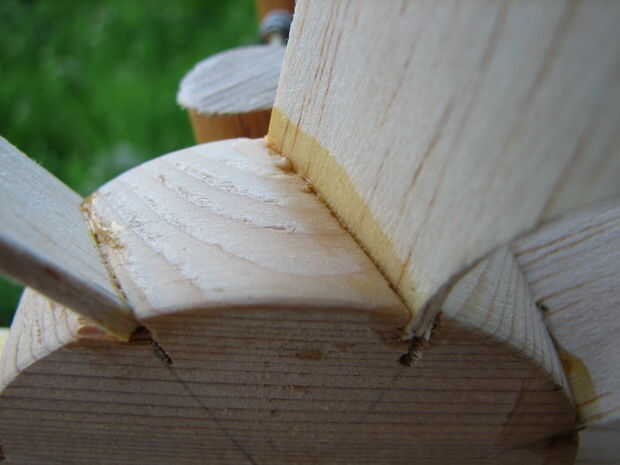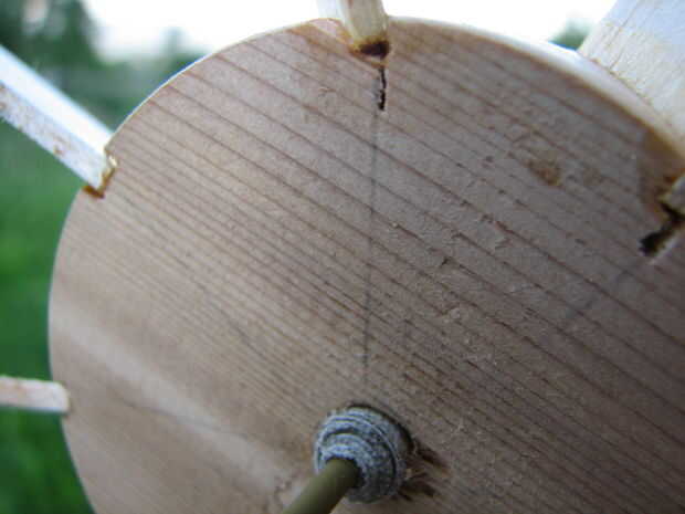 Ahora para el molino de viento. Para la rueda de madera, usted bien puede hacerlo usted mismo, o la mayoría de las ferreterías más grandes llevar cosas como eso, de todos modos Asegúrese de es 7 pulgadas de diámetro. Para medir donde cortará para las cuchillas de molino de viento, primero tomar una regla y dibujar cuatro líneas que se dividirán la rueda en 8 partes iguales. A continuación, toma un transportador y cuando la línea alcanza el borde, dibuje un ángulo de 45 grados en el borde curvado de la rueda. Entonces usted debe terminar con 8, líneas de 45 grados. Cortar con una sierra de mano cerca de 1/8 pulg de profundidad. Ahora perfore un agujero de 1/8 de pulgada en el centro de la rueda.