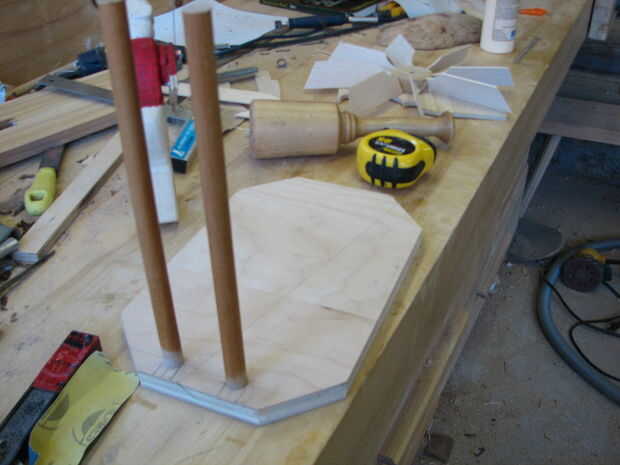 Para la base. Mida 2 pulgadas hacia abajo de cada esquina y uso ésos como referencia puntos para cortar uniformemente las esquinas. Mida 3/4 de pulgada hacia abajo desde un extremo y y marque los orificios para el montante coloca 2 pulgadas aparte. Taladre los orificios con una broca de 5/8 de pulgada y luego introducir los tacos en. Este paso puede ser un poco difícil de seguir, pero lo más importante es que los montantes son 2 pulgadas aparte y están centrados sobre en un extremo de la base.