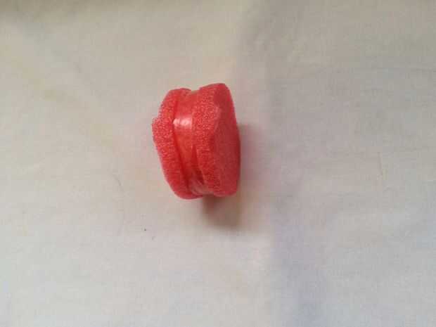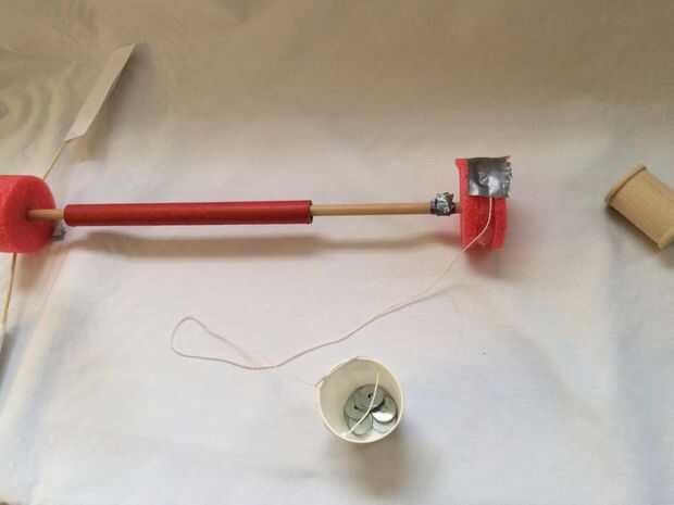Cambio de la bobina para el pedazo de tallarines de la piscina. Puede pegamento o cinta adhesiva los tallarines de la piscina a la espiga (si no está bien conectado, la espiga hará girar sin la pieza de tallarines de la piscina y su molino de viento no será capaz de mover cualquier peso). Tomar la cuerda que está conectada a la bobina, desconéctelo y conéctelo firmemente en la parte hundida de los tallarines de la piscina, de tal manera que la cadena pueda envolver alrededor de los tallarines.