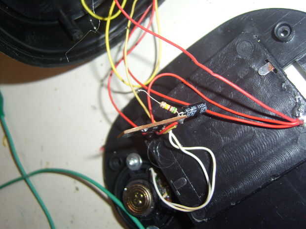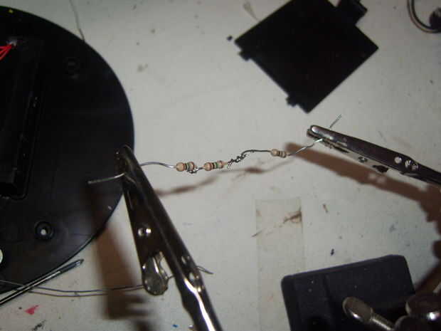 Soldado una resistencia de 470 K en fila a la resistencia del reloj para hacer el sonido vaya más lento. Entonces conecté el resistor de reloj doble vía árbol resistencias de 1 M en una hilera con el punto de soldadura marcado en la imagen. Siga las instrucciones de las imágenes!