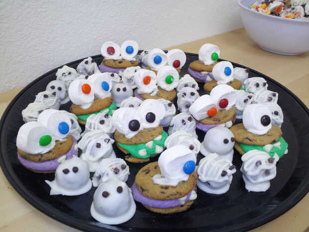 3 para decorar, prensa restante blanco vainilla chips en helar para los dientes de la hornada. Uso reservado helar la mezcla para colocar ojos, utilizando decoraciones como desee.