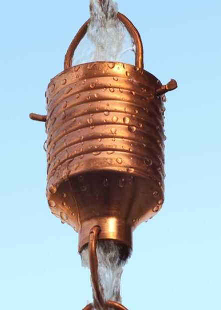 cadena de lluvia de cobre puro de Juno será la cadena del canal de lluvia ideal para usted. Teniendo a la persona inteligente imaginativa, arquitectura en cuenta, la cadena de lluvia Juno actúa como una bajada de agua y ofrece una versión de un ingenio bueno que no se puede encontrar en otros lugares. Notable es su cilindro como forma con ondulación y cobre natural no tratada termina clásico estilo verdaderamente lo distingue de estilo tradicional lluvia cadenas. Cadenas de lluvia monarca es un excelente recurso para taza y enlace estilo lluvia cadenas de canal y la cadena de lluvia juno se fabrica con cobre puro gruesos, cada uno taza de medidas 2,1" diámetro y 3.2" altura. Cada longitud de 8,5 pies de lluvia canal cadena viene montada con las 17 tazas Unidas por enlaces circulares que se suma a la apelación y la forma de la cadena del canal de la lluvia. El cobre natural progresará en un final de pátina marrón con el tiempo en la superficie que es atractiva a la vista.