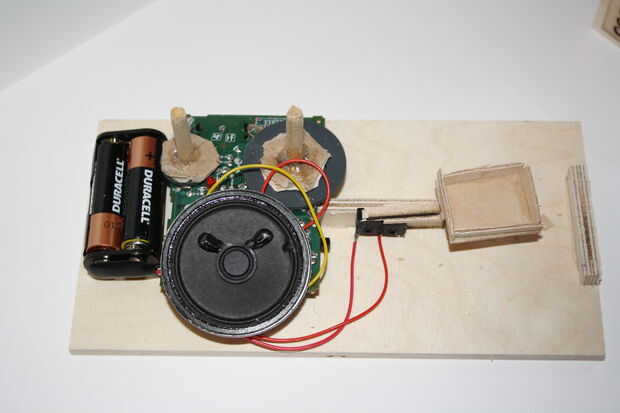 conectar el circuito a la a la parte superior de la pieza inferior de madera y deslizable. Coloque 2 varillas del volumen y la puesta a punto para actuar como selector.