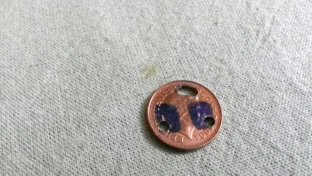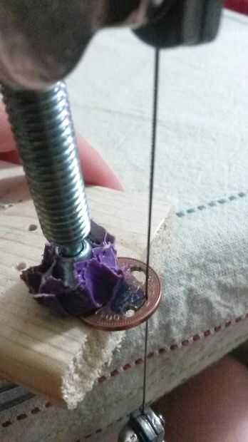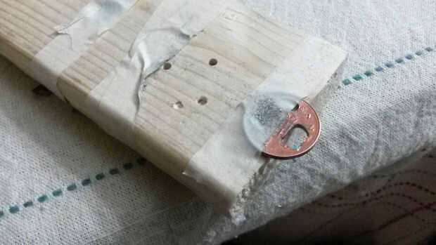 La moneda en el borde de la placa de la cinta y sujete la moneda y la tabla a la superficie de trabajo.
