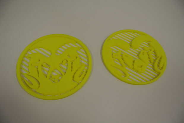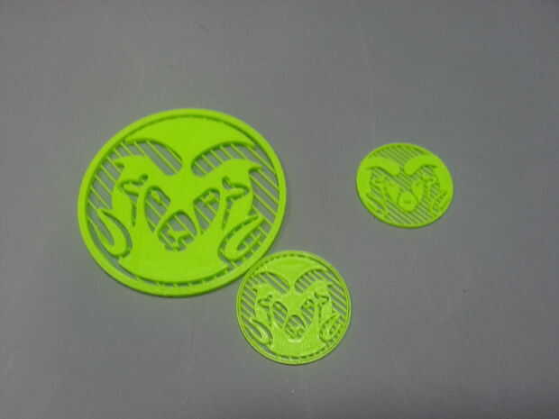 La siguiente idea que tuve fue poner dos logos rayado y hacer logos en una moneda de dos caras contiguas. Imprimí un total de 4 insignias diferentes con dos diseños, inversos de cada uno y dos colores. Puedes ver todas las combinaciones de logos en la primera imagen.
