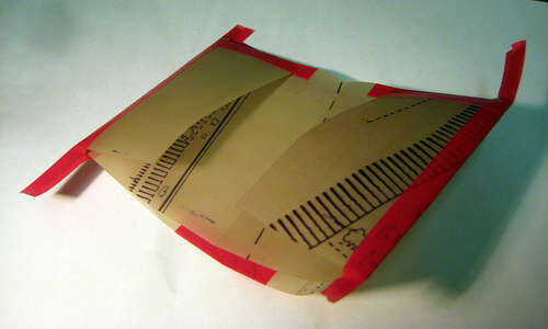 Voltear todo el conjunto de nuevo para que la cinta es el lado pegajoso hacia arriba. Doble B más sobre A y alinee los bordes libres, por lo que se conocen en sus esquinas inferiores, como se muestra. Usted debe tirar B para que tht se encuentran ya que es 5mm más corta para permitir que la cartera a cerrarse fácilmente. Doblar la cinta y frotar para sellar.
