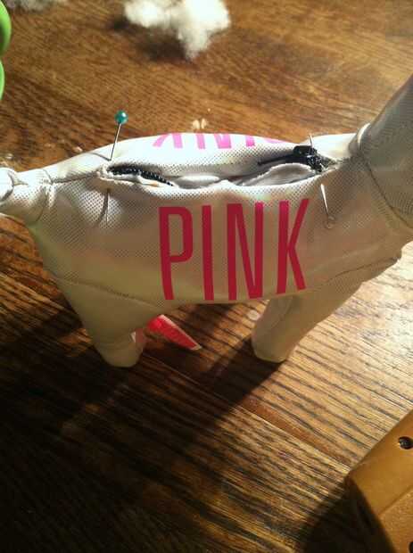 Pin su cremallera para el animal. Poner la bolsa en él y alfileres. Luego pégalo al animal