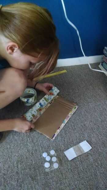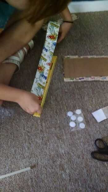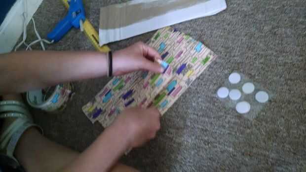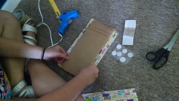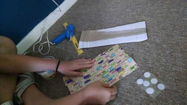3. Ahora lo que vas a hacer es tomar la pieza de cartón y pegamento caliente el tablero de tarjeta a los 5 pedazos de pato cinta rápido para que el pegamento no se sequen