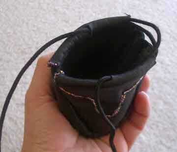 Hacer un corte con un cuchillo en el interior de la bolsa de la cadena. Con la ayuda de un ganchillo de crochet enrolle la cadena alrededor de la bolsa apertura y hacia fuera de la ranura, uno de los extremos de la cuerda que sale un lado y el otro extremo en el lado opuesto de la bolsa, para que al tirar la cadena cerrará la bolsa.