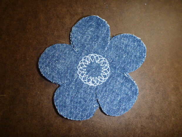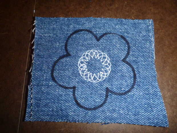 Pie de costura de flor y piensan que es una forma increíble añadir bordado, así que usé para hacer los centros de la tela de flores para adornar la parte superior de mi cartera! Cortar 3 capas de dril de algodón todo en líneas de diferentes granos. Es más interesante después de que están lavadas y "florecen" si están todos se deshilache diferentemente. Capa de juntos y luego utilizando el pie de la flor hacer un bordado sobre cada conjunto de 3.
