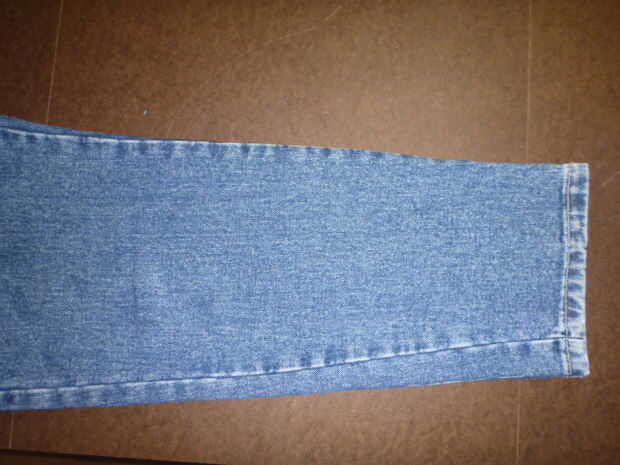 Encontrar un par de jeans que desea upcycle.  Extienda las piernas pantalones uno encima del otro.