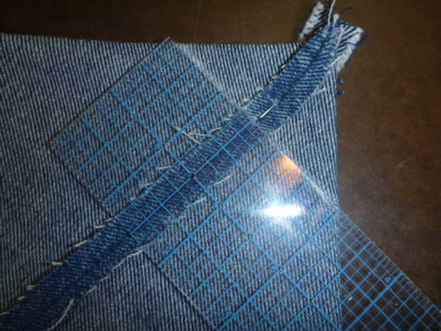 Coser las costuras laterales de la mezclilla y las piezas de revestimiento y luego ambos inferior costuras. Ahora viene la magia! Doblan la costura lateral para que coincida con la costura de la parte inferior para hacer un punto. Ahora coser a través del punto. Al hacerlo, se crea un "fondo". Observe que la regla esté alineada con la costura en el centro a 1 1/2" con el extremo izquierdo de la regla toque la bolsa doblada y la derecha de la regla tocando el otro pliegue en 3". Marca y luego coser a través de esta línea