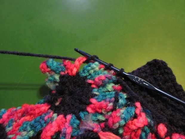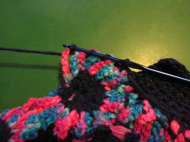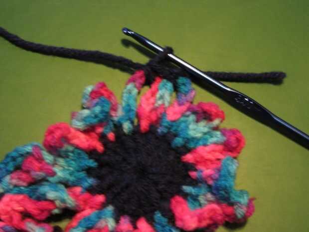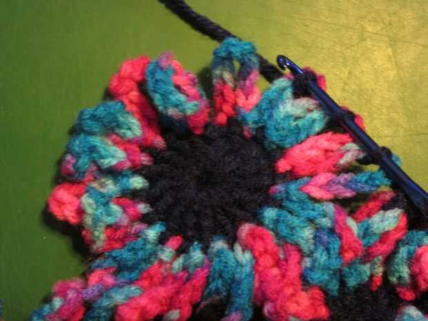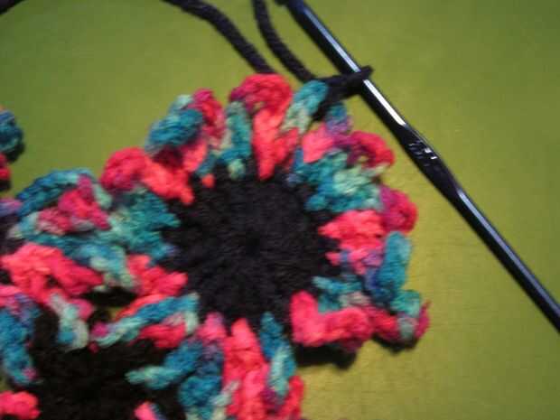 Fila 2-6: Sc en todas las puntadas de sc de la primera fila. Repita para la fila 3-6. Asegúrese de tener la misma cantidad de puntos que tienes en la primera fila en la segunda a través de la sexta fila (en mi caso, yo tenía 16 puntos de sutura y mantiene 16 puntos de sutura en mis filas). Una vez que termine la fila 6, ch 1 y sc por las filas de sc 6 hasta llegar al lado más corto de la bolsa (la cantidad final de sc antes de llegar a la fila de lado debe ser puntadas sc 6). Disminución de coser los 2 primeros pétalos, entonces * disminuir la puntada de la petals.* siguiente 3 repetir hasta llegar a la última flor. La última flor será una disminución puntada para los 3 primeros pétalos y una puntada de disminución para los próximos 2 pétalos. Use un marcador para marcar la última puntada.