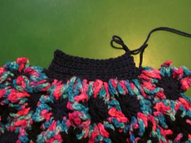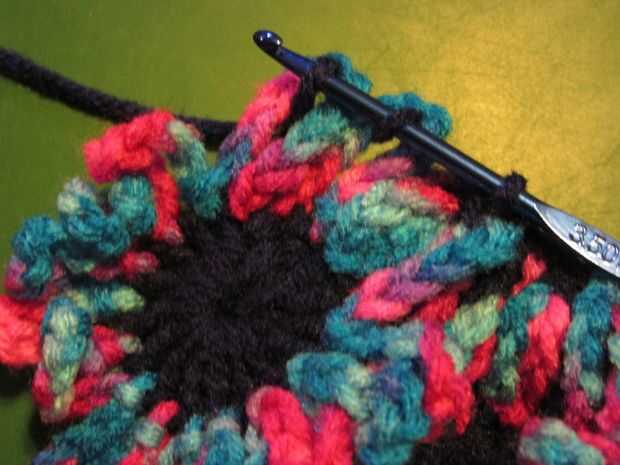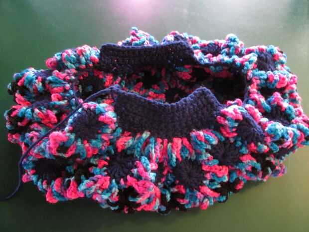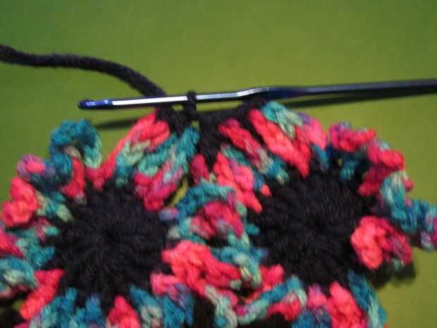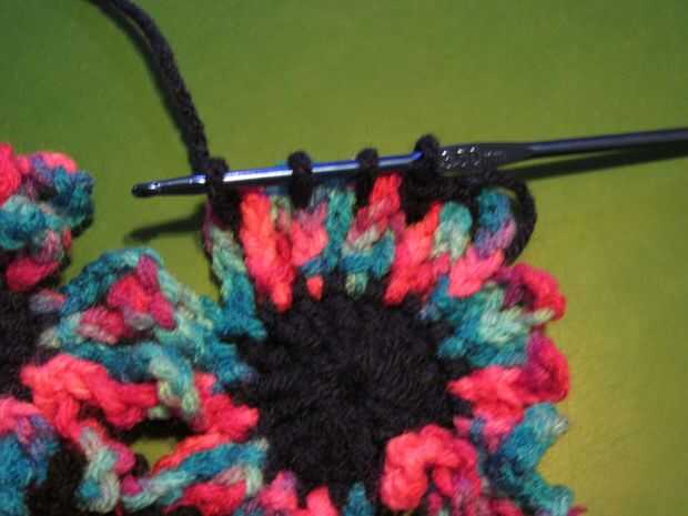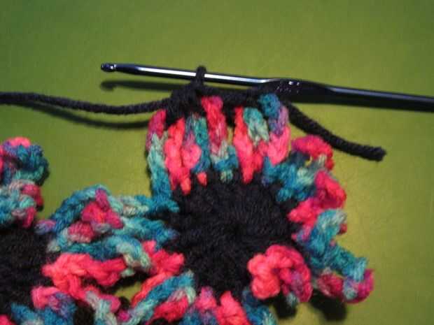 Fila 1: St a lo 5 pétalo del pétalo de esquina de la derecha contando desde la izquierda (cinco pétalos deben quedar en el lado). SC para el siguiente pétalo de la izquierda. * Disminuir la puntada mediante la recopilación de los tres pétalos. Debe tener 4 lazos en el gancho. Tire del lazo de hilo de trabajo a través de la loops.* 4 repetición hasta llegar a la última flor. La última flor será una disminución puntada para los 3 primeros pétalos y una puntada de disminución para los próximos 2 pétalos. CH 1 y convertir su trabajo.