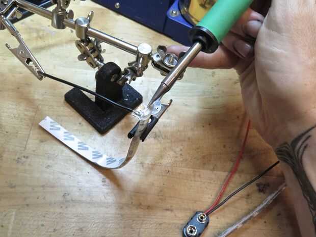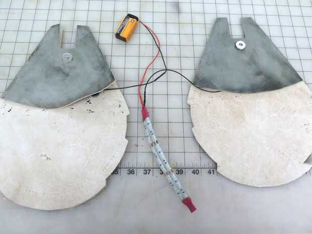 Para crear las luces en la parte trasera de la nave, soldado dos tiras de 9 LEDs a un clip de batería de 9V con el cierre de la bolsa como el interruptor. Había conectado el cable de alimentación de los LEDs directamente al cable rojo del clip de la batería, luego soldar la tierra de los LEDs a un lado del cierre magnético y la tierra de clip de la batería al otro lado.