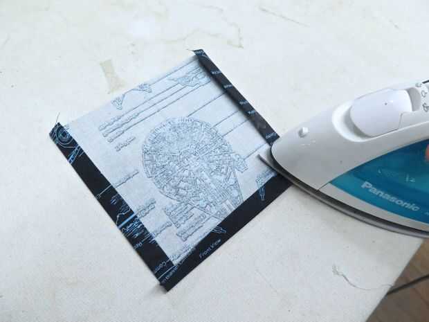 Para crear el revestimiento de la bolsa, he presentado mi tela de técnica de lectura de Star Wars y cortar dos piezas de la guarnición principal y una plaza para actuar como un pequeño bolsillo. Presiona y había dobladillado los 4 lados del bolsillo y había cosido abajo en tres lados para una de las dos piezas de forro principal.