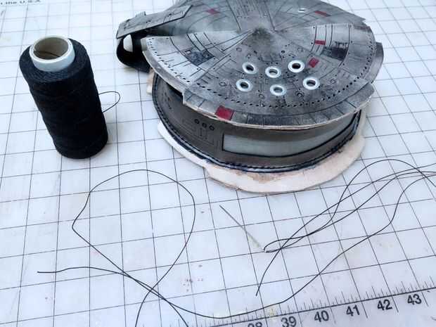 Entonces comencé por un lado de costura de la bolsa en el pedazo de pared. Yo centrado en la pieza de apertura de hiperimpulsor a lo largo de la parte inferior del motor y comenzó cosiendo junto con mi hilo encerado y aguja embotada del cuero.