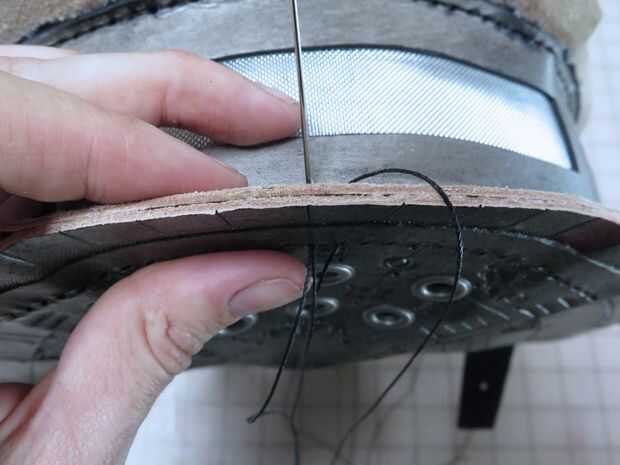 Cuando llegué a un extremo de la línea de los agujeros de la costura, dio vuelta alrededor y cosido detrás la otra manera, esta vez relleno en los espacios opuestos entre los agujeros de la costura, haciendo los puntos parecen una línea intacta similar a una puntada de la máquina de coser. Cuando volví a la parte inferior de la bolsa donde había comenzado, seguí recorriendo el otro lado de la bolsa repitiendo el proceso. Al final vuelta cosido unas puntadas para sujetar el hilo antes de cortarlo. Cada vez que me quedo sin hilo me acabo de hacer unos pespuntes y entonces comenzó un nuevo hilo.