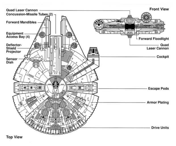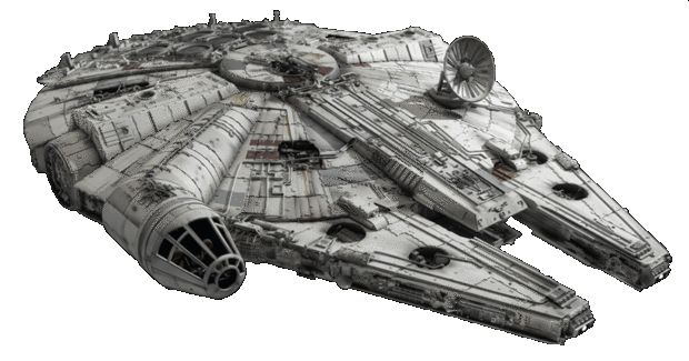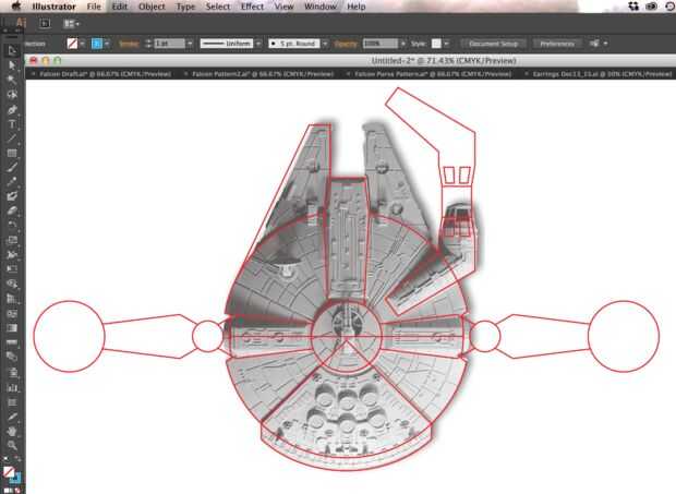 Para crear un buen patrón para mi monedero del Halcón Milenario, primero miré en muchas fotos de la nave y pensó en cómo su forma mejor pudiera traducirse en una bolsa. Luego importados en imagen en Adobe Illustrator y trazada alrededor de la forma de la nave para obtener la proporción correcta. Quería mantener el patrón relativamente sencillo, pero para dar los diferentes elementos como mucha profundidad y detalle como sea posible. También quería ver cuánto podía usar partes ya existentes de la nave como elementos funcionales de la bolsa.