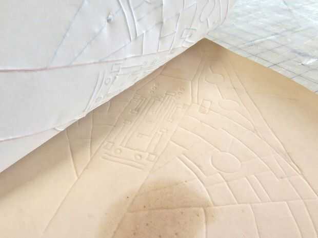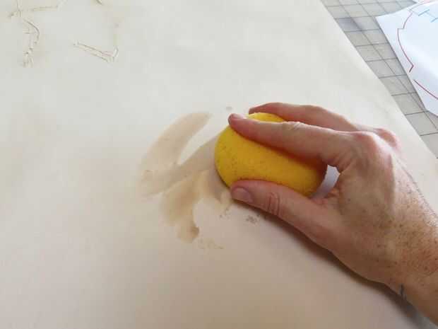 Para rastrear mi patrón en cuero, yo primero aproximadamente recortar cada una de mis piezas dejando un pequeño espacio alrededor de los bordes. Luego extienda mi piel en mi estera de corte y "había encajonado" por la cosa entera con agua y una esponja de humedecimiento. Esto permite que el cuero para tomar las líneas de trazado más eficazmente.