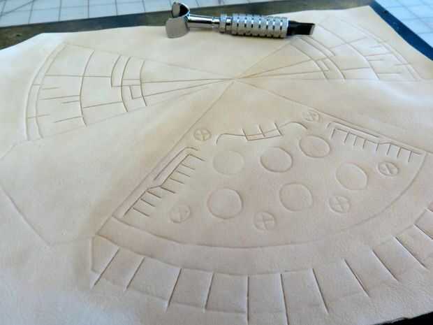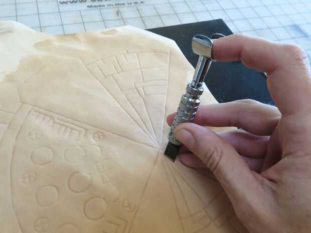 La primera herramienta que utilicé fue un cuchillo giratorio. Esta es una herramienta de talla que permite cortar surcos de su piel donde desea definir líneas o los bordes de los elementos del patrón. Tienes el cuchillo con el dedo pulgar y el dedo medio mientras el dedo índice descansa en la silla de montar en la parte superior. Empuje hacia abajo el cuchillo con el dedo índice y tire de ella y guiarla alrededor de curvas con otros dos dedos. La acción tiene un algunos acostumbrando a, pero con un poco de práctica llega a ser bastante simple.