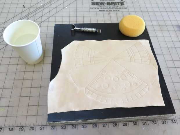Para crear el información en el halcón, yo solía algunas herramientas de cuero diferentes talla y textura de las líneas que había trazado ya. Es mejor hacerlo sobre una base dura con una superficie ligeramente más suave en la parte superior. Yo uso una combinación de cuarzo losa de tablero y poundo para esto. El cuero también debe ser mojado en todo este proceso para que siempre mantenga una esponja y agua cerca, caso volver a mi piel cuando empieza a secarse.