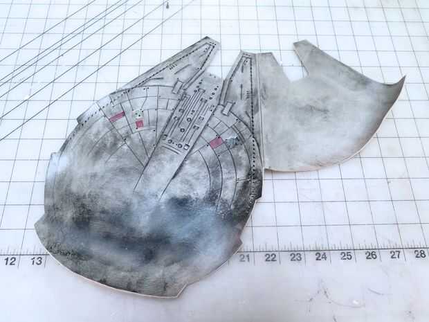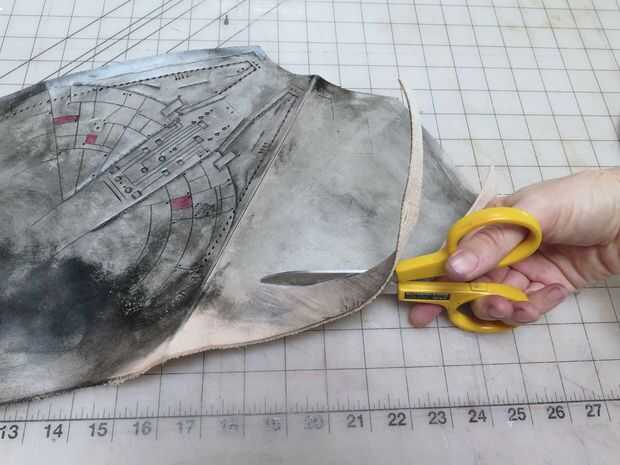 Cuando se había secado el acabado de mis piezas, cortado lejos la piel sobrante de los bordes de mis patrones. En la mayoría piezas Esto implicó simplemente siguiendo las líneas había trazado, pero en las dos piezas del cuerpo principal, me aseguré de recortar secciones delanteras primero, luego doblar la capa de revestimiento bajo y trazar el contorno de la capa de frente en la frente antes de cortar hacia fuera para las dos capas coinciden perfectamente cuando pegan.