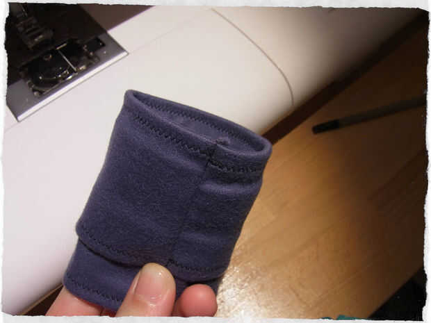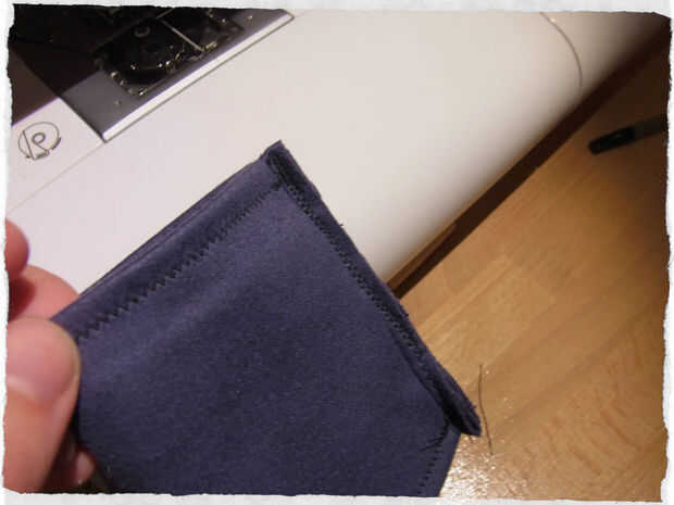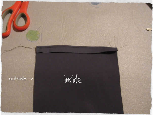 Ahora doblar hacia adentro las aletas exteriores y doble la cosa entera en el centro (del lado corto, que ahora es el más largo). Asegúrese de que el lado que se desea hacer frente hacia fuera más adelante está ahora en el interior. Y comience a coser una línea recta en el borde abierto.