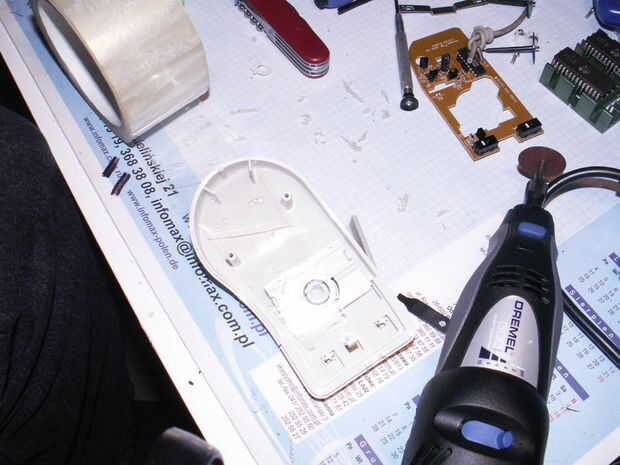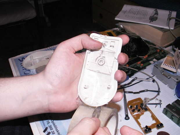 En mi mouse es bonito Aran. Tres pedazos de cinta accros la vivienda hicieron el truco. Podría ir con una sola pieza pero para estar seguro...