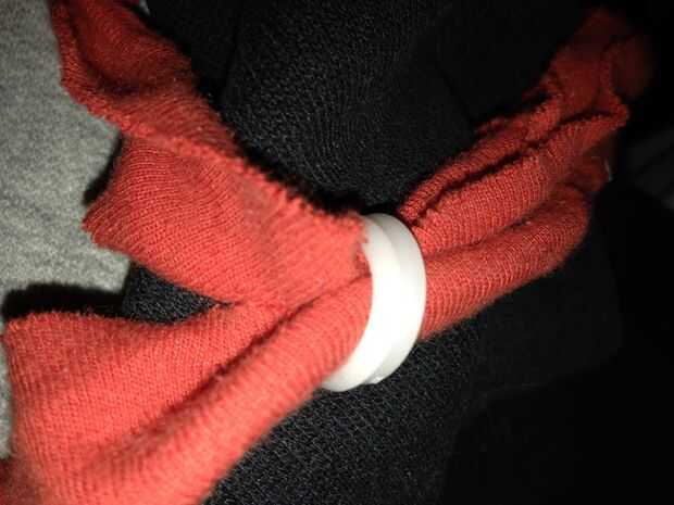 Utiliza tiras de una pulgada de una vieja camiseta para hacer bandas alrededor de la parte inferior de la correa. Tuve algunos anillos de plástico sobrante de otro proyecto, así que puse dos de ellos en cada banda. Envuelve las bandas alrededor de la correa varias veces y me suturan los extremos. Este adorno sirve para tres propósitos: 1. ayuda a los bolsillos laterales cierre un poco más, así que yo no pierda su contenido, 2. los anillos me permiten poner llaves, tarjetas de fidelización del supermercado y desinfectante de la mano y 3. es decorativo.