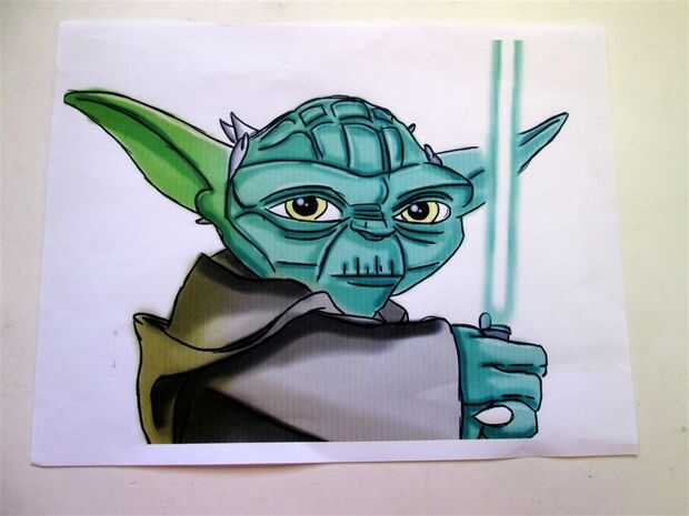 Buscado en la red alta y baja para una caricatura de Yoda que yo podía dibujar a mano en la bolsa por mirarlo. Tengo un board de Pinterest que cubrió a opciones y finalmente encontraron algo que pensé que podía copiar a mano. Solía a regular PDF copiar la foto en y ampliar a un tamaño de paisaje que imprimiría bien y pude ver el información que necesitaba. Mi impresora funcionaba de la tinta por lo tanto, los cambios en el color que se puede ver en la foto, pero necesitaba las líneas de mira.
