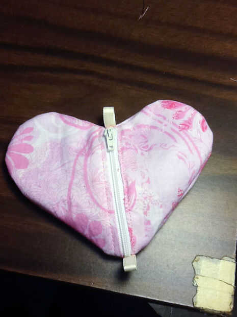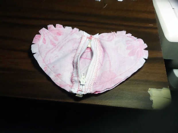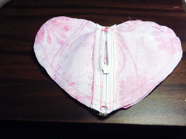 Ajuste de nuevo la cremallera y cinta para que coincida con la forma del corazón. Clip de la curva por lo que se pone mejor cuando se gira hacia fuera. clip el zigzag que mantiene juntos los 2 lados de la parte superior de la cremallera. Gire a la derecha hacia fuera.