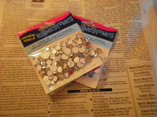 materiales necesita de diamantes de imitación. pistola de pegamento caliente 1 2-diamantes de diferentes tamaños 3-el periódico También estoy decorando mina con un accesorio de plumas.