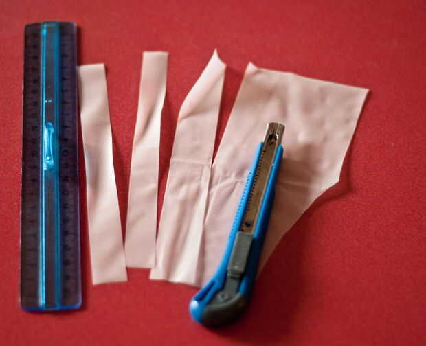 Como cintas puede utilizar cualquier material. Opté por una lámina de plástico transparente, a pesar de que la cartera va a funcionar mejor con un material no elástico. Así que si tienes una cinta agradable de la tela, te sugiero probar con eso.