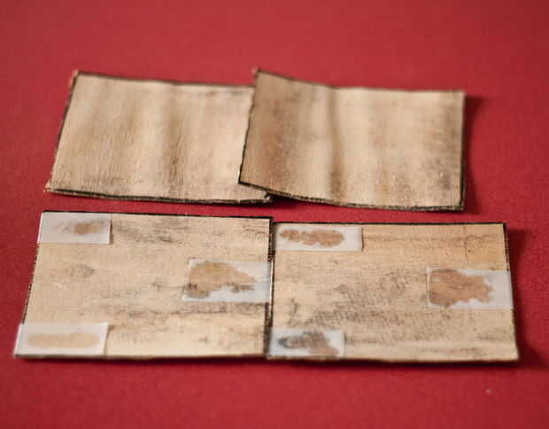 es el turno de la banda central. Esto es un poco difícil de insertar en la posición, pero después de pegar el primer extremo no tendrá dificultad para estirar y pegar el extremo opuesto de la cara externa de la placa de madera.