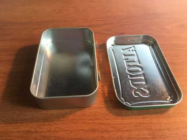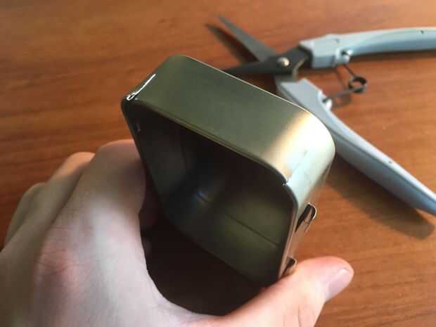 Antes de que podemos empezar a cortar la lata, necesitamos quitar la parte superior de la lata Altoids del "cuerpo" de la misma. Solo sacar la parte superior y usted debería estar bien. Una vez hecho esto, coge la herramienta de corte y comience a reducir a la mitad sobre el "cuerpo" de la lata Altoids en cada una de las cuatro esquinas. Entonces, comience a cortar desde una esquina a otra esquina, en una línea recta (de lo contrario la cartera será desigual).