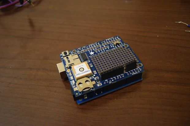 Coloque el registrador GPS Adrafruit encima del arduino (puede necesitar para soldar en los encabezados de las entradas analógicas Si no están allí ya).