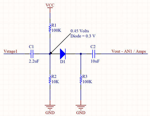 Ahora tienes una forma de onda en 0VCC con sólo los picos positivos de la señal de ser leído por el ADC.