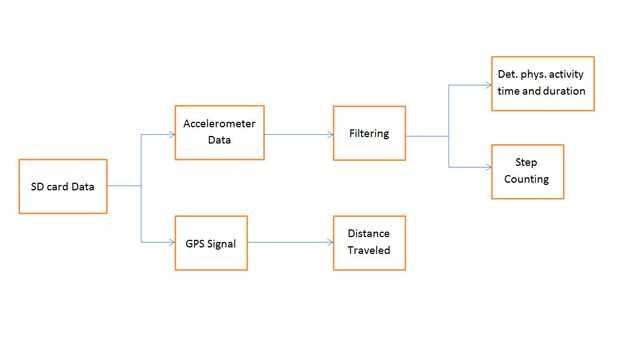 Para ser capaces de controlar la actividad física de una persona, un acelerómetro es necesario para poder determinar el cambio de posición. El acelerómetro es capaz de determinar los cambios de posición con transductores de fuerza que en lecturas de capacitancia con acelerar el movimiento. Esto puede utilizarse para determinar cuando una persona da un paso, habrá un cambio rápido en la aceleración cada vez que se toma un paso. Los datos también pueden utilizarse para determinar cuando una persona realiza una actividad física, mediante el establecimiento de un umbral, por lo que si la magnitud de la aceleración supera el umbral, el dispositivo registrará la duración de la actividad. También se incorpora un módulo GPS en el dispositivo para determinar la ubicación real y el tiempo real de los datos. Los datos de coordenadas se pueden utilizar para calcular distancia recorrida restando la distancia entre el punto de partida y la situación actual del tema. Todos los datos se registran en una tarjeta MicroSD, que puede almacenar los datos como un archivo de texto y se puede acceder en un equipo.