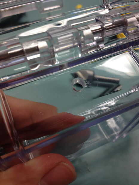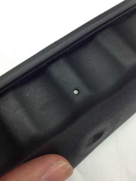 Las imágenes muestran el agujero que perforó en el caso, cómo hicimos el agujero en el interior de goma, y lo que la inserción de goma parecía después de la perforadora.