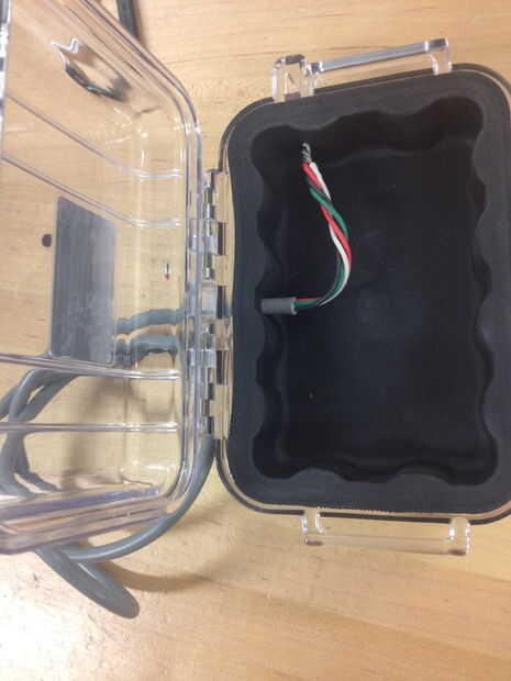 Para el caso del monitor de agua nos ordenó Pelican 1010 casos, ya que son de un tamaño perfecto para todas las piezas que se utilizaron. Una vez recibido y había eliminado el mosquetón pequeño utilizamos un taladro para hacer un pequeño agujero en la parte trasera de la caja. Este orificio permitirá los cables conectar desde el transductor piezoeléctrico a la aruduino, protoboard y finalmente la pantalla LCD. Medimos el ancho del cordón se utilizó y se hizo un agujero un poco más pequeño, para que exista menos espacio para que la humedad en el caso.