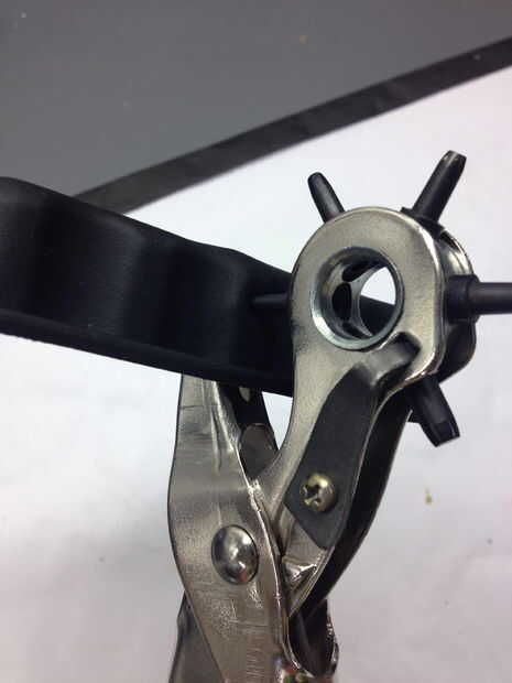 Del inserto de goma de la caja utilizamos un agujero de cuero golpe a golpe un pequeño agujero en el material. Asegúrese de que la línea de agujeros para arriba bastante bien! El agujero del inserto de goma puede ser más pequeño ya que será capaz de ampliar para que el cable pase a través.