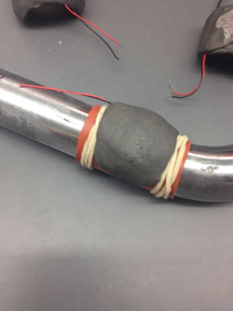 Utilizamos un pequeño piezo puesto que era el piezo que nos dio los mejores resultados. Para el molde de epoxy utilizamos JB Weld SteelStik. Use guantes cuando maneje epoxy! Colocamos un trozo de caucho sobre un trozo de tubería que compramos, había asegurado con una banda elástica a cada lado y coloca una pequeña porción de epoxy mezclado en la goma de la ducha. Después de que habíamos formado el epoxi nos coloca el piezo en la parte superior y formó otro pequeño pedazo de epoxy mezclado de eso para asegurar el piezo. Asegúrese de que los cables no son enteramente cubiertos! El epoxy que usaba muy rápidamente. Dejamos esta cura durante 24 horas.