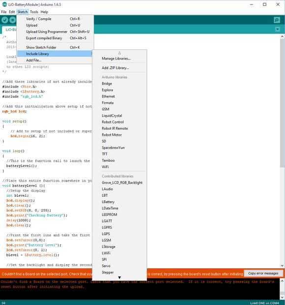 Sólo deja biblioteca de LCD. Empezar por descargar el .zip aquí. Entonces simplemente importar utilizando el importador de biblioteca de la Arduino IDE. Bajo del bosquejo..., biblioteca incluyen... slect agregar. Biblioteca ZIP... Navegar a la ubicación descargado el archivo y selecciónelo. Tan fácil como eso, usted está listo para ir y puede utilizar las funciones incluidas mediante la adición de #include "rgb_lcd.h" a tu lista de bibliotecas en la parte superior de su bosquejo.