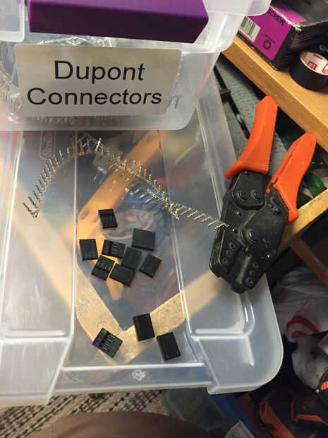 Utilicé algunas telecomunicaciones Cruz conecta cable y conectores de engarce de Dupont. Caliente un poco pegamento para mantener los conectores en su lugar y eso es todo...