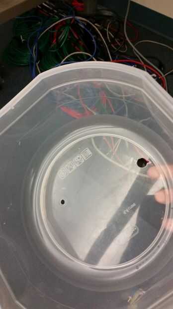 Tome el tazón de fuente, una pinza, la broca cilíndrica de metal y el sensor de ph. Utilizando la pinza de freno para obtener la anchura de ambos la broca y el sensor de encuentran las brocas adecuadas que cortará a través de la taza y dejar un sello hermético. Asegúrese de que al perforar el recipiente para tener un pedazo de madera bajo el plástico de la taza para que el plástico no atrapa en el taladro. Asegúrese de ajustar el recipiente durante la perforación. Te recomiendo que "peck" el recipiente varias veces en lugar de ir directamente a través de modo que usted puede conseguir un agujero más limpio.