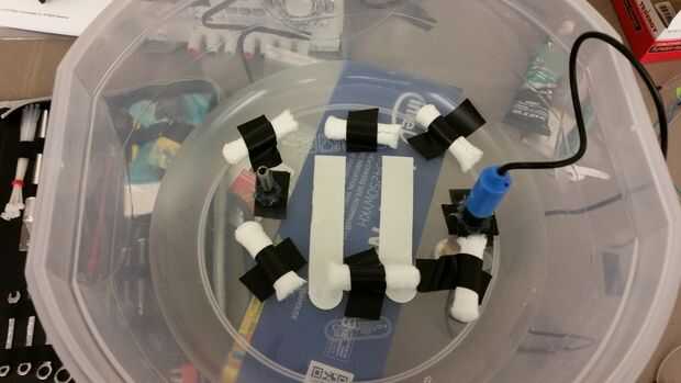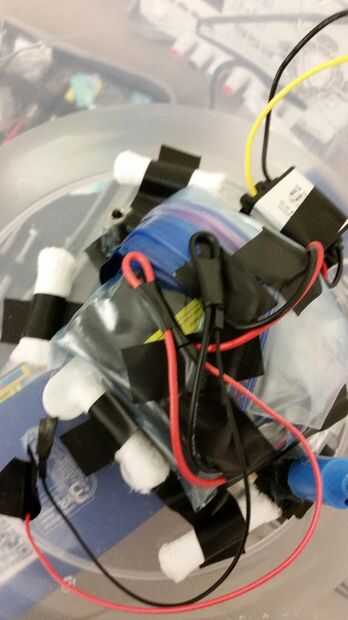 Tenga en cuenta que hay múltiples agujeros en el núcleo. Con un par de zipties, hacer pequeñas "asas" en la parte inferior del núcleo, bucle a través de los agujeros. Con cinta adhesiva, fijar las manijas a la base del recipiente. Con la sonda de temperatura a la izquierda y la sonda de pH, el Nucleo se acuesta del lado de la batería más cercana a usted.