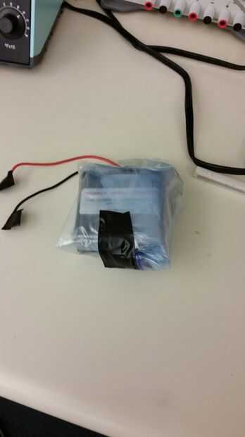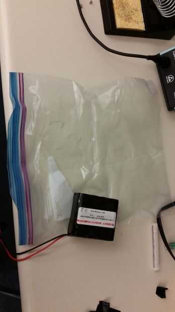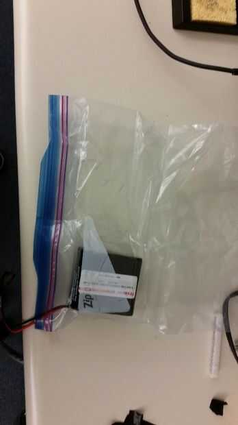 Puesto que la batería es particularmente sensible a fugas, envuelva la batería en la bolsa de plástico (fotografiada), dejando los dos cables que salen como deben conectarse con el resto de la circuitería de. Tratar de dejar la parte superior de la bolsa que contiene la batería ser como plana como sea posible, ya que más adelante ataremos el tablero de pan en la parte superior de la bolsa. La bolsa de plástico proporcionará la pila con una segunda capa de protección en caso de una fuga. Fijar la bolsa de plástico y la batería a la base del recipiente entre el conductor metálico y sonda de pH utilizando que tiras de un comando.