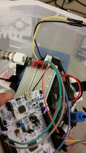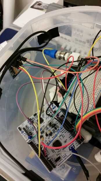 Ya debe haber conectado la Junta pH de la placa en el paso anterior. Conecte la sonda de pH en la tabla de pH. Para mantener el cable de la sonda fuera del camino, envuelva el cable alrededor del borde del tazón de fuente (no demasiado, para no interferir con el sello cuando ponemos la tapa en el recipiente) y sellen el alambre con cinta adhesiva eléctrica como en la imagen.
