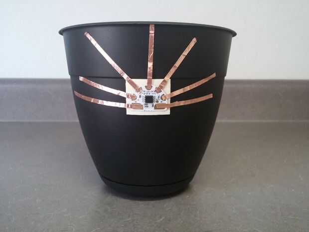 La cinta de cobre debe conectar el microcontrolador a cada componente en el circuito alrededor de él. También debe conectar a la batería fuera del tiesto.